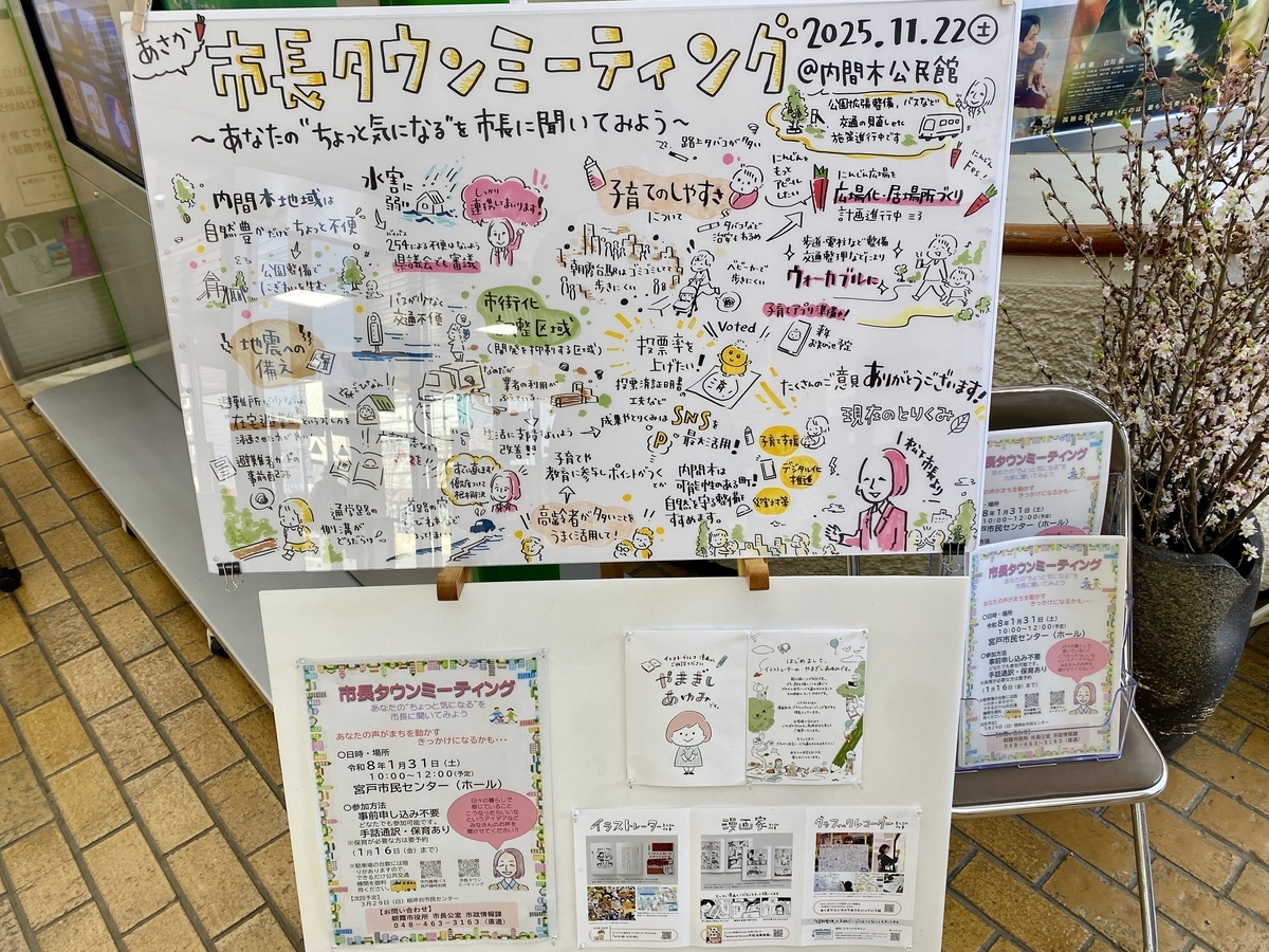 本視察の内容とは別ですが、市長のタウンミーティングの様子がグラフィックレコーディング(会話の内容を絵で表す取り組み)で残されていました。すてき。私の市政報告会や鈴木議員との議会カフェなどもこんな風にまとめられると、いいなぁ。誰かやってくれんか(絵心と画面構成力がないため、他力本願)