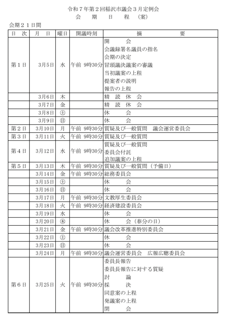 3月5日の開会日をもって、3月議会がスタート。6〜7日に議案書の読み込み期間である「精読休会」。10〜12日に議員個人が市政全般のことについて質問したり、提案したりする「一般質問」。14〜18日まで議案を部会に分かれて集中審議する「委員会」が開催される予定です。