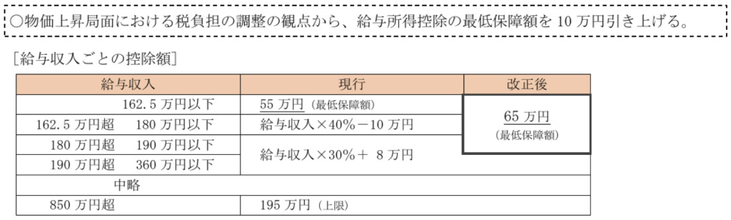 この給与所得控除は年収に応じて増減しますが、その最低ラインが引き上げられたというのが① の給与所得控除の最低額引き上げになります。