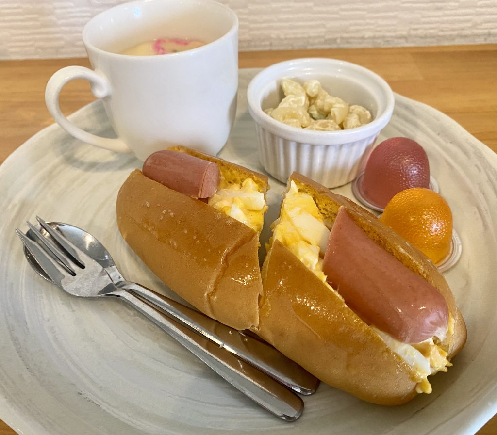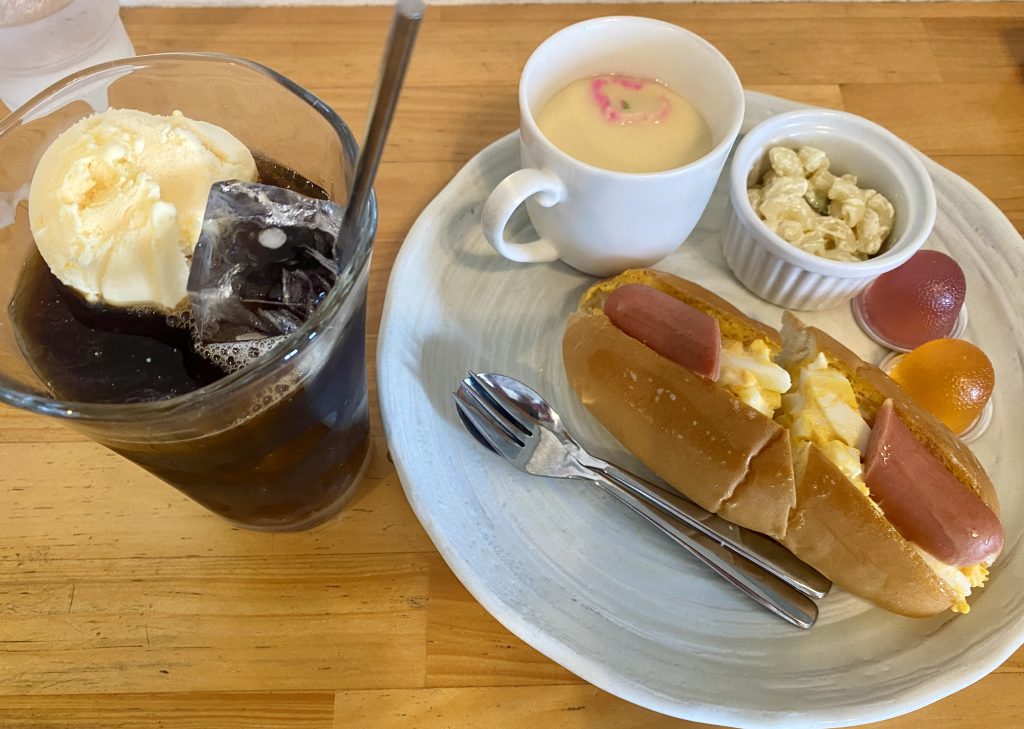 今回はホットドッグを選択。豚肉のソーセージではなく、魚肉ソーセージですが、中のたまごサラダがおいしくて、合う。付け合わせのパスタ、茶碗蒸し(これも珍しい)もおいしかったです。特に茶碗蒸しはあたたかくて、優しい味でした。