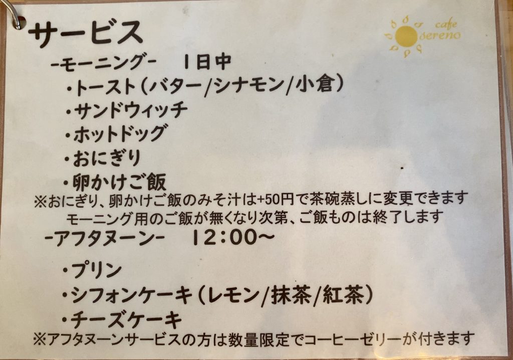 モーニングはドリンク代のみで、トースト(バター・シナモン・小倉)、サンドウィッチ、ホットドッグ、おにぎり、卵かけご飯の中から選べます。