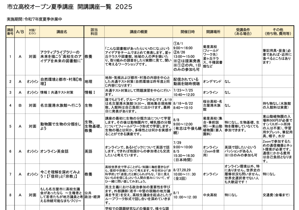 これは名古屋市教育委員会が近年取り組んでいる「市立高校における学校の枠を越えた学び」の一環で、名古屋市立高校生であれば誰でもさまざまな講座に参加できる「オープン夏季講座」です。