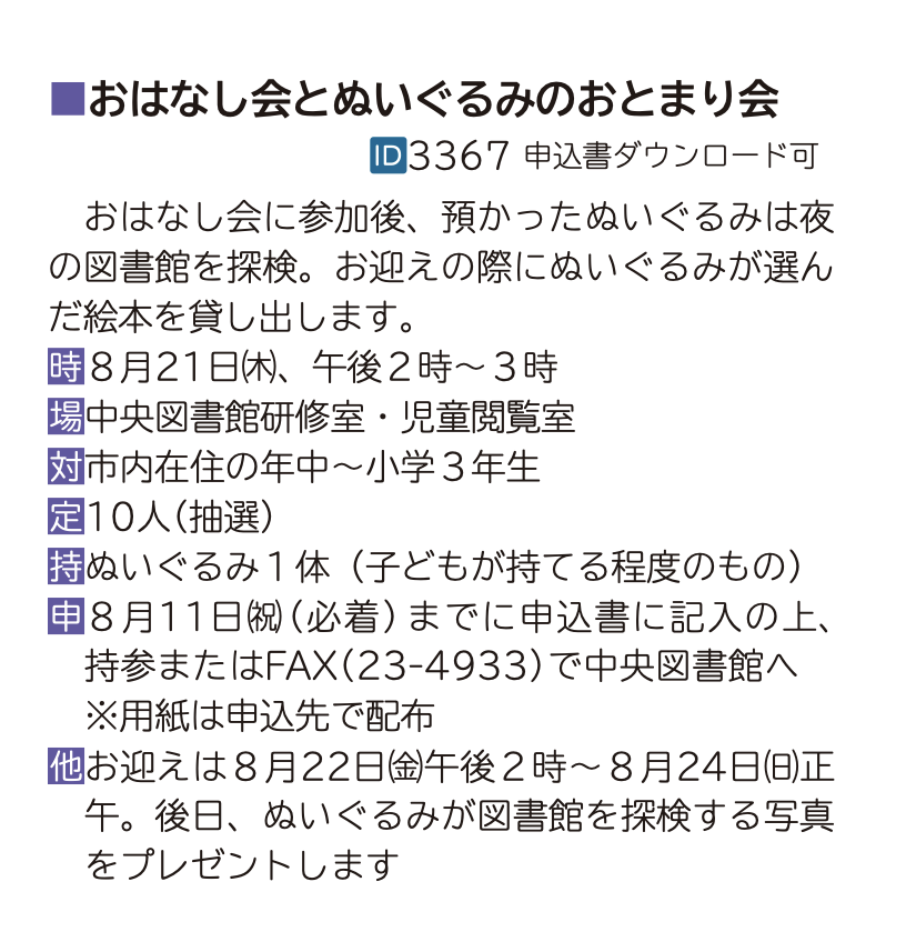 一つ目は、稲沢市で数ある子ども向けイベントの中でも最推しの「ぬいぐるみのお泊まり会」です。