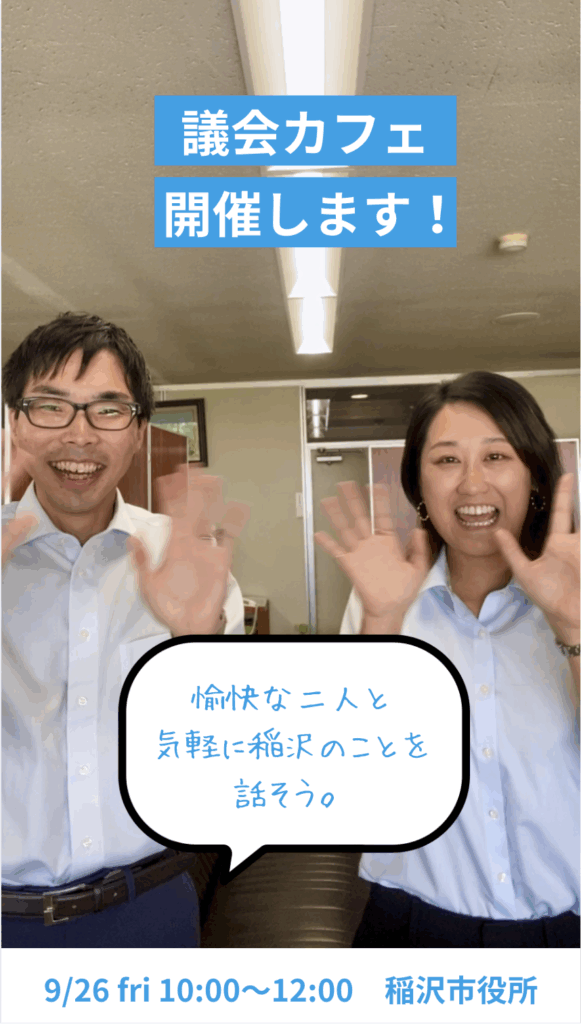 お話のテーマは、9月議会トピックス(第二子以降の保育料の割引、水道料金の見直し、役所の開庁時間短縮等)ですが、極力難しい話にならないよう、私と鈴木議員とでのんびりやるので是非ご参加下さい!