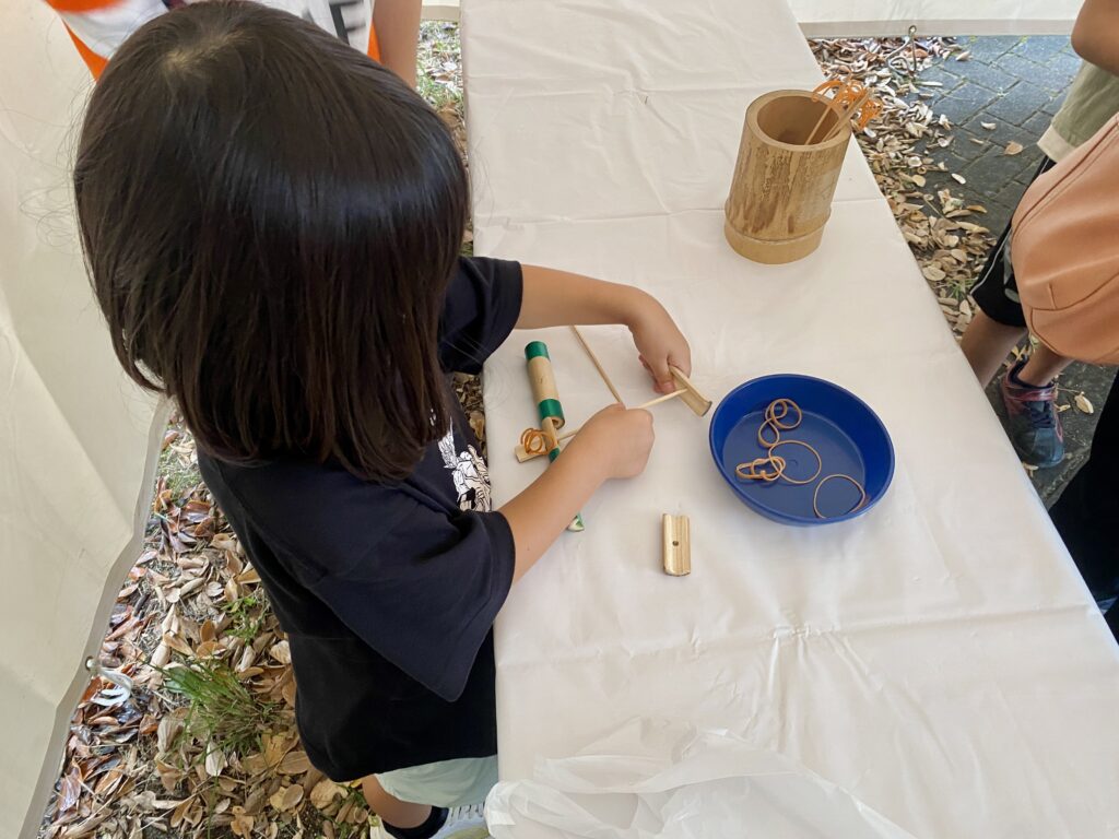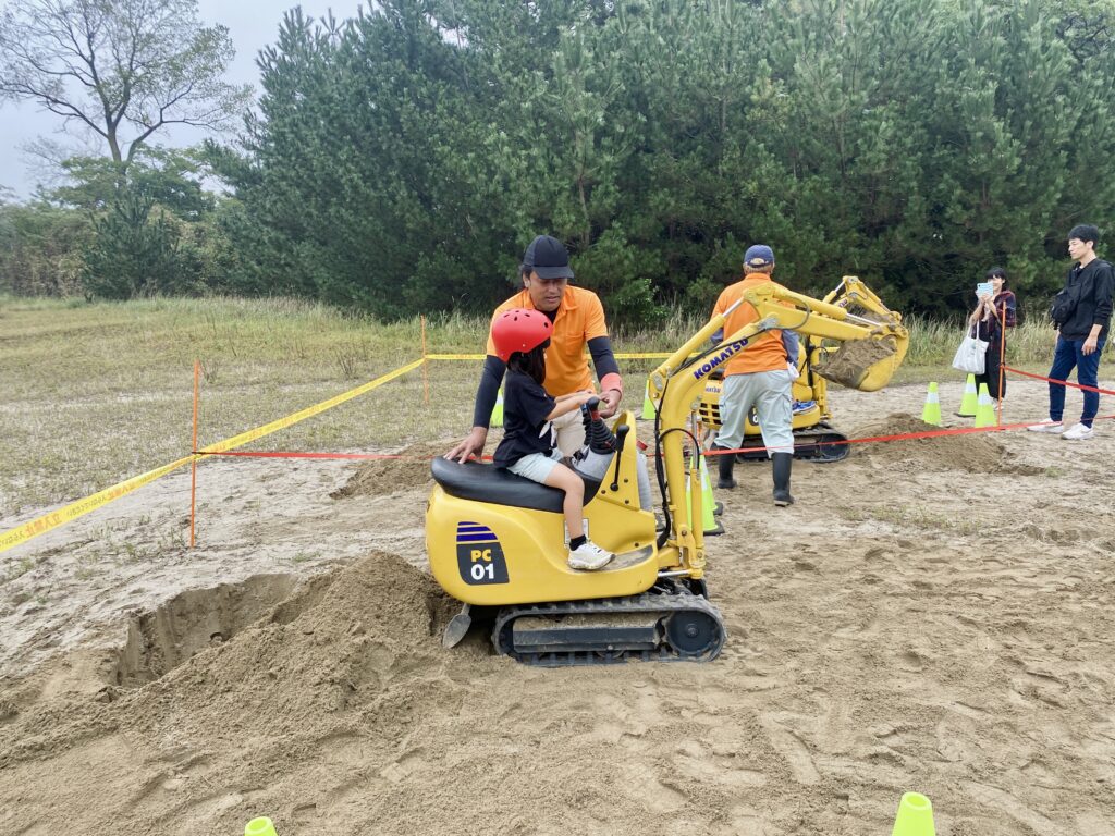 イベントの開催日と翌日は土日で、当日参加できる催しもいくつかありました。私は上の子と参加して(下の子は体調不良のため、妻がみてくれている間に、私は上の子の体力を消費させるために連れていきました)、ちびっこ建設機械体験や竹てっぽうの工作などをしました。