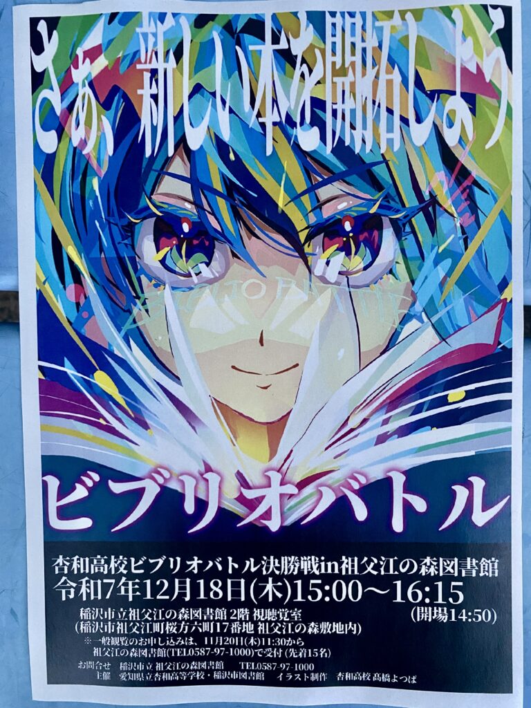 高校生の訴えを、大人が真剣に聞いて、形にすることを助ける。高校生議会を開いて良かったと思える胸熱の展開ですよね。ビブリオバトルの開催を告知する このポスターも稲沢市っぽくなくて素敵で、なんと杏和高校の生徒さんが描いてくれたそうです。