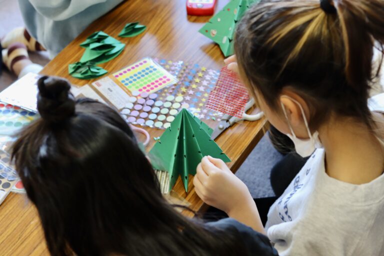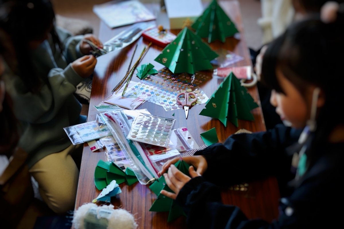 また、参加者の親御さんが厚紙でクリスマスツリーを作るワークショップをしてくれました。お店で有料でやるレベルのもので、保育園児から小学生まで幅広い年齢の子どもが参加してくれました。今年はクリスマスらしい活動ができないと思っていたので、すばらしい機会になりました。