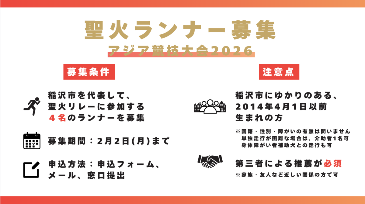 愛知県内の各市町村にてアジア競技大会聖火リレーが実施されることになり、稲沢市でも募集が始まりました。人生において、聖火ランナーに選ばれる機会はなかなかないと思います。